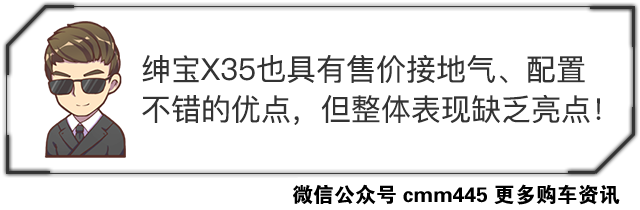 绅宝X35的设计时尚感相当不错,其车身长宽高为4300×1815×1640mm,轴距为2570mm,车内的乘坐空间符合小型SUV的主流水平。采用的1.5L发动机配合爱信4AT的动力总成平顺性不错,但变速箱挡位少、发动机低扭不强造成油耗偏高。