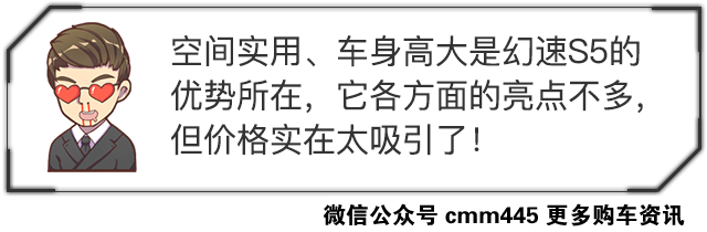 幻速S5和宝骏560一样定位为紧凑型SUV,可是它的定价真的很有杀伤力!2650mm的轴距保证了车内有充裕的空间,而全景天窗、ESP、上坡辅助、后座出风口等是它的亮点配置。1.3T涡轮增压发动机的动力不算强劲,但油耗表现良好。