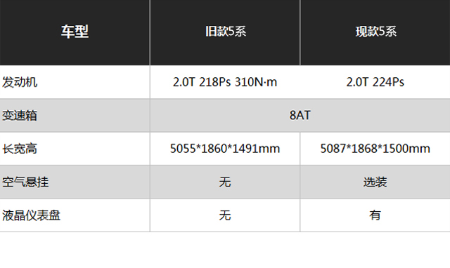 新5系的变化还是比较全面的,从底盘(可选装空气悬挂)到动力系统(采用新的涡轮增压器)再到内饰配置(新的多媒体系统),都有升级。但实际上若只论行驶品质和舒适性的话,现款的5系不会比新车落后太多,况且现在优惠力度这么大,实在是购买豪华车的不二之选。