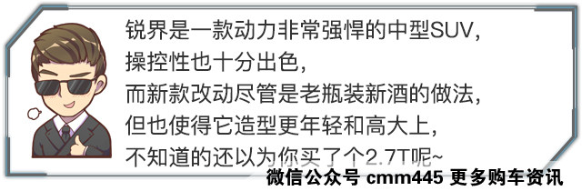 新款锐界的更新只是在外观上的提升,主要是在2.0T的车型中增加两款使用了原2.7T的四驱运动型的外观套件,使得锐界的视觉效果更具有攻击性,并命名为两驱/四驱运动型(EcoBoost 245);售价分别为30.68和32.68万。主要的辨别方式也可以在车尾标上“EDGE”的标识下方看到一个“S”的字眼表明自己运动型的身份。