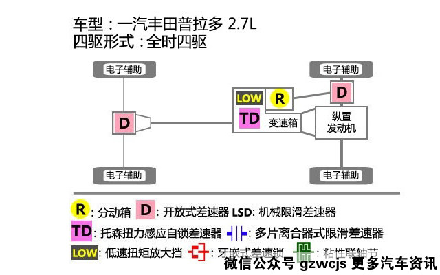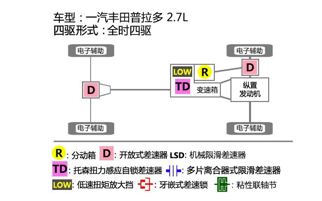 以丰田普拉多全时四驱的示意图为例,全时四驱系统会有一个中央差速器,名为托森扭力感应自锁差速器,能将动力分配到前后驱动桥,无需驾驶人介入,全部动作均自动进行调节。