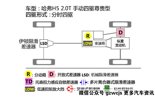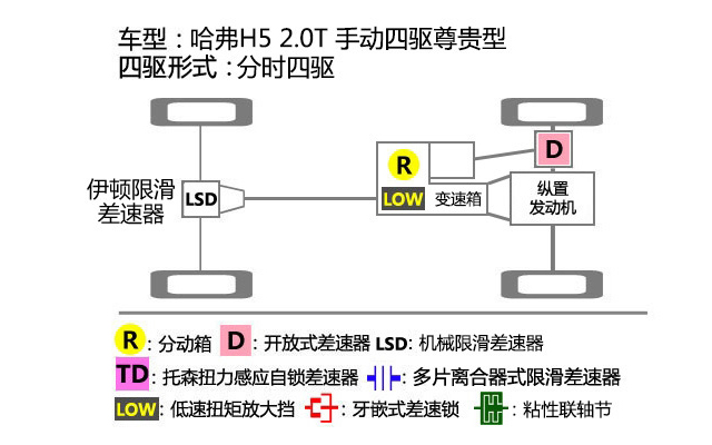 以哈弗H5为例,H5的四驱结构比较简单,中央是硬派SUV中常见的分动箱结构,并带有低速四驱挡,其传动比为2:1。前轴轮间为开放式差速器,没有任何轮间限滑能力。后轴轮间装备了伊顿自锁式限滑差速器,它是提升哈弗H5四驱性能的利器。