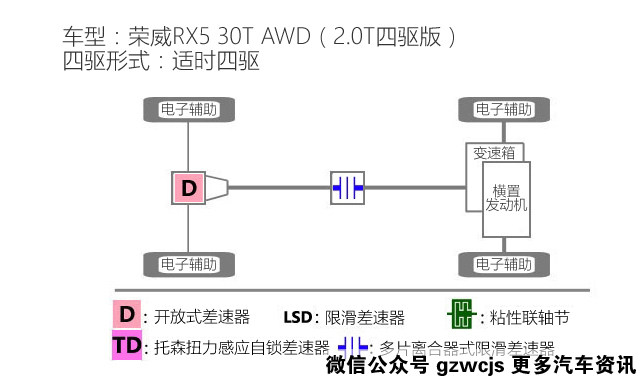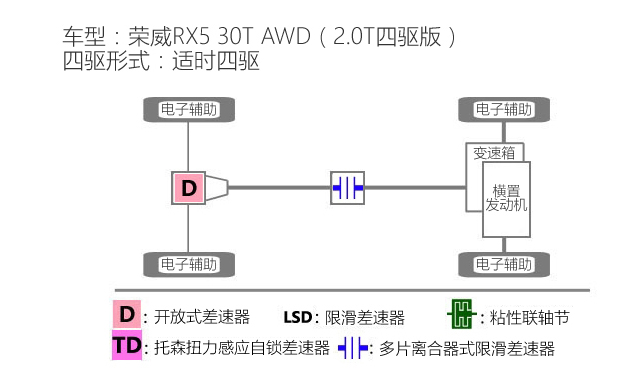 以荣威RX5为例,该车型采用的是基于前驱的适时四驱系统,前后轴的动力分配理论上可以在100:0到50:50间进行切换,前后桥轮间都是开放式差速器,四个车轮带有电子系统辅助,来实现轮间限滑的作用。
