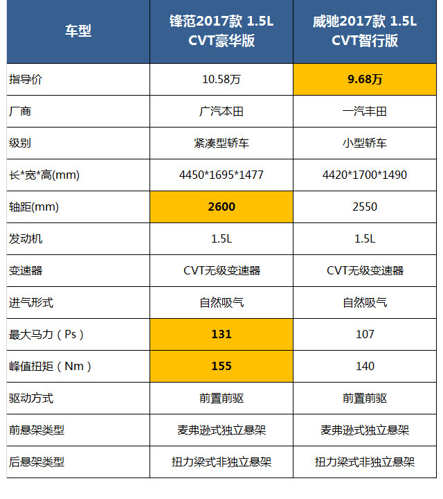 从配置的对比上看,虽然威驰在动力上的调校参数不如本田的高,但是威驰全系(包括1.3L和1.5L),都标配ESP车身稳定系统,而锋范只有中高配才有,且在价格上也比锋范便宜约1万元,而如果多预算这1万元,锋范有着比威驰更长的轴距,更好的动力。