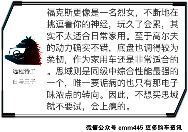 底盘方面,虽然高尔夫采用的是扭力梁式后悬架,但过一些坑洼时,还是展现得十分柔韧。如果说福克斯偏向于操控的话,那么高尔夫就是偏向于舒适。处理震动时,会更为干净,少了一些路感。