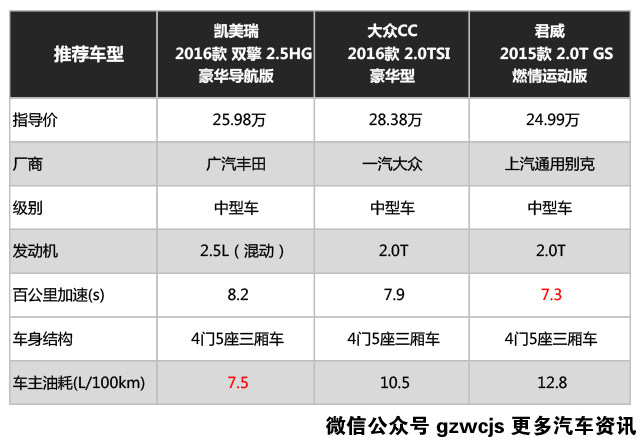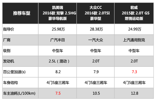 三辆车都各有各的优点,凯美瑞的优势在于混动系统,市区拥堵路况也就是8升左右的油耗。君威GS的优势肯定就是动力了,7.3秒的百公里加速,优惠完之后二十三四万就能落地,性价比还是不错的。三辆车当中优惠最大的就是CC了,价格永远是最具杀伤力的武器,再加上一个值得炫耀的无边框车门,做决定其实很简单。