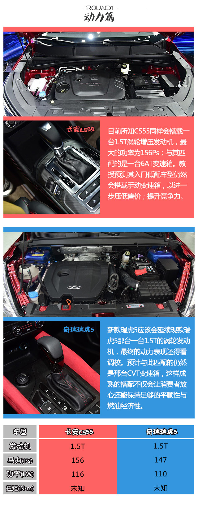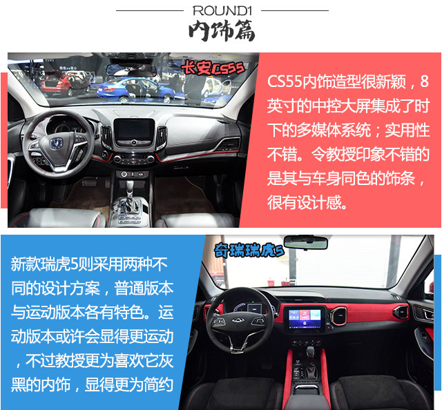都是新款,如何在它们之间选出最好的那款呢?CS55的实车比照片更有气场,车身尺寸也有一定的优势,但目前还没价格配置信息。而瑞虎5价格预计会跟老款差不多,现款的配置也有一定的参考价值。因此教授的建议是再等等,等到最终的配置与价格出来后再作决定。