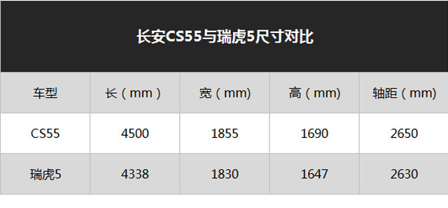 新款瑞虎5的身材有所缩小,三围尺寸为4338*1830*1647mm,整体造型显得更为紧凑。让教授惊讶的是其轴距反而加长了20mm到2630,对车内的空间会有一定的提升。长安CS55一开始就定位于入门紧凑型SUV,三围尺寸介于CS35与CS75之间。4500*1855*1690mm的车身尺寸比瑞虎5会更大一些;2650mm的轴距表现让其有车内能扩展出更宽裕的空间。