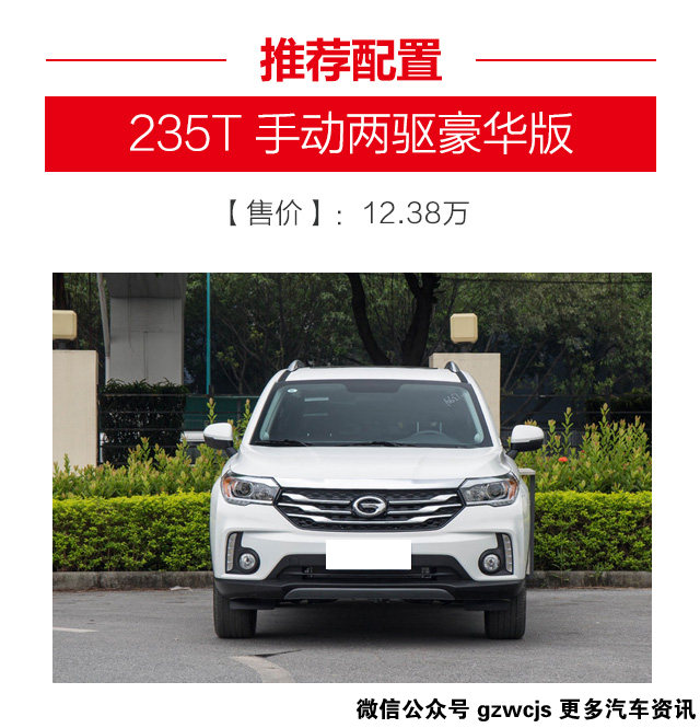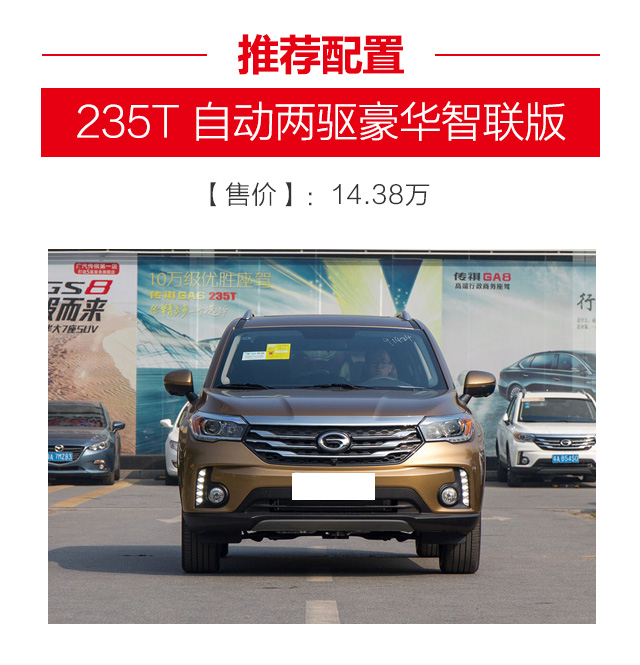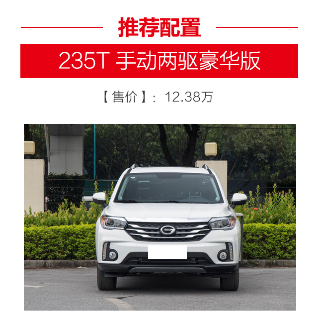 假如你是日常家用的消费者,那教授推荐售价14.38万的 【235T 自动两驱豪华智联版】,1.5T的发动机搭配爱信6AT变速箱,整套动力总成运行顺滑且省油,开起来就是舒心。而论配置的丰富程度,其又比售价13.38万的版本(1.5T+6AT车型的低配)多出了胎压监测、前后排头部气囊、真皮方向盘、全景影像、真皮座椅、电动加热座椅、自动空调、折叠/加热外后视镜、带GPS功能的8英寸屏幕。总的来说,这1万元也是物超所值。而如果你是追求运动性能的猛汉,那教授我推荐售价12.38万的【235T 手动两驱豪华版】,在配置看齐上述自动挡车型的同时,售价足足便宜了2万元。而其手动挡车型的驾驶感受而言,也确实是值得表扬。