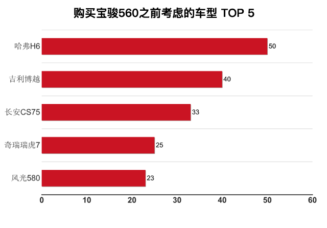 在购买宝骏560之前,车主们考虑最多的是依然是霸主哈弗H6,这货人群基数太大,无解;而第二的则是吉利博越,但多数车主放弃的理由均是担心油耗高,看来这已经成主要问题;第三的则是长安CS75,虽然没有多大变化但销量一直很稳定。