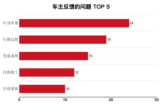 车主反馈最多的问题在外观上,不少人觉得车门关门时阻力过大,不易关闭,尤其表现在前门上;其次是车门会有异响。