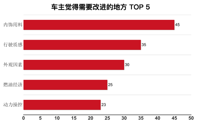 车主觉得最应该改进的是内饰方面,部分车主觉得做工用料等让人感觉到比较廉价,大面积覆盖的硬塑料材质触感并不算好;而且新车也有一定的异味。