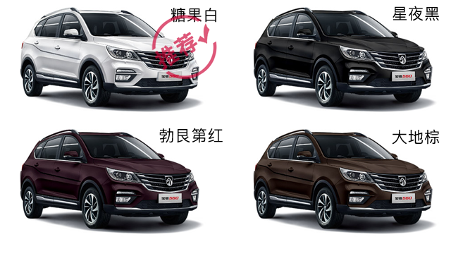 宝骏560的颜色选择比较少,糖果白依旧是车主们首先考虑的色调,毕竟白色显大而且耐脏。星夜黑大地棕也会有人选,但比例相比白色来说就差得远了。
