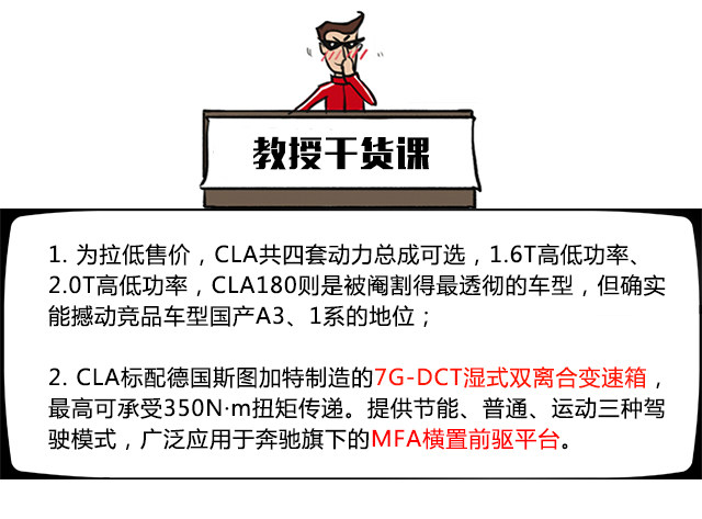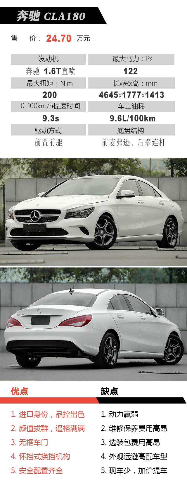 点评:硕大的三戟叉logo、深邃星辉中网、无框车门、怀挡挡把,条件允许再加装AMG轮毂(¥8300),集满满逼格于一身,同价位车型中,找不到第二辆溢价能力比CLA高的轿车。鱼与熊掌不可兼得,出于成本控制的考虑,CLA 180并不以动态性能见长,1.6T低功率发动机被“刻意”调校为122Ps、200N·m。加价提车、维修保养费用高昂也是潜在车主们需考虑的问题。