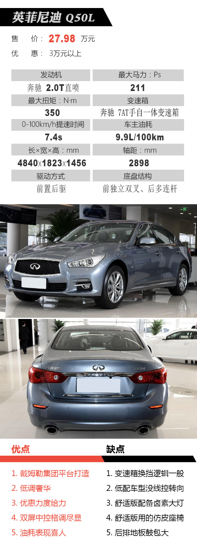 点评:作为英菲尼迪的首款国产车型,Q50L已在华度过两个多年头,48mm的轴距加长在照顾市场和坚持本性之间找到韧性平衡,但不温不火的市场表现迫使它终日打折迎人。双叉臂前悬架以及奔驰动力总成赋予其不俗的运动底子,因而被标榜运动的ATS-L、3系视为眼中钉。清秀的玉面书生前脸更适合低调、但又向往豪华车的消费群体。