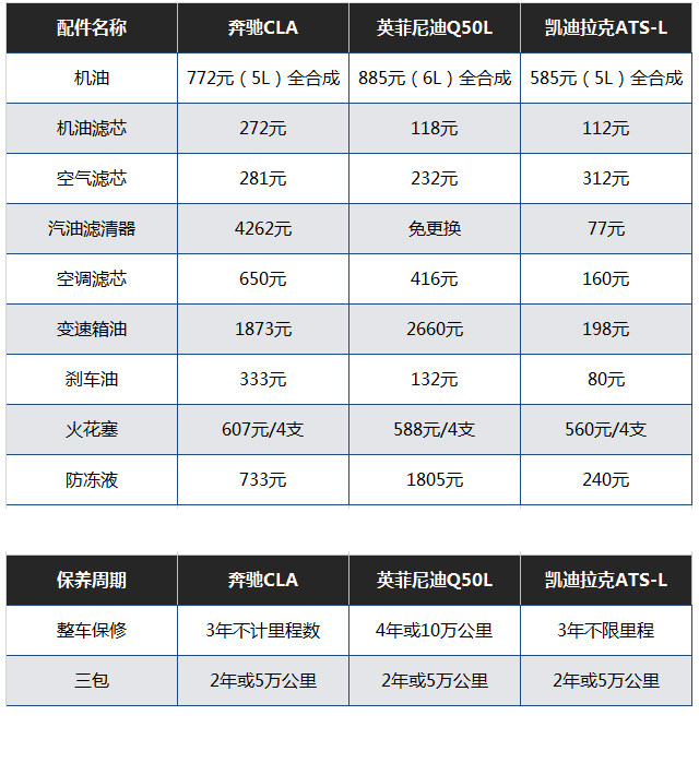 如你所见,这三款入门级豪华轿车落地价格相差无几。保养费用方面,ATS-L无疑最为厚道、实惠;采用不少日产配件的Q50L配件价格在可接受范围内;而素来保养费用高昂的奔驰并没我们所想的高,但亦名列前茅,一般家庭供养吃力。