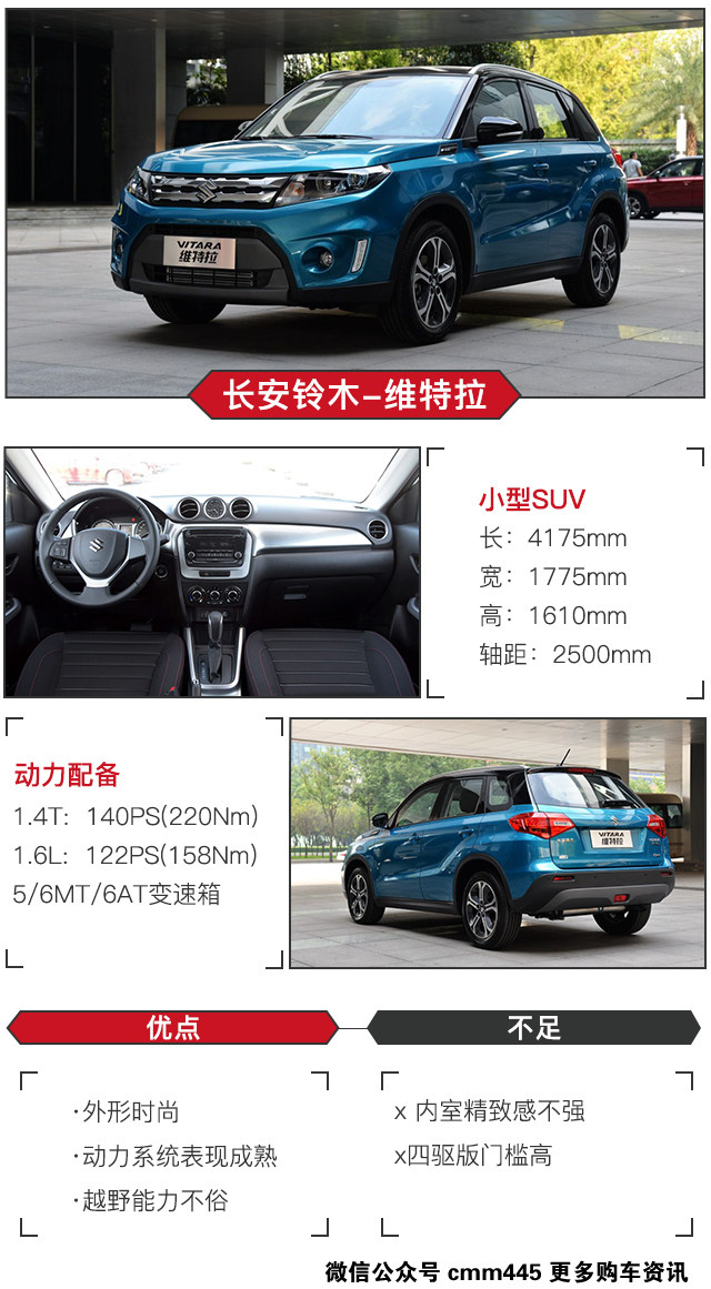 维特拉是一款完全能够挑战缤智/XR-V等主流小型SUV,它有着不错的性能表现,超大的全景天窗,越野表现也算是在同级中出类拔萃的。除了空间和做工方面略显不足外,其它表现相当吸引人。