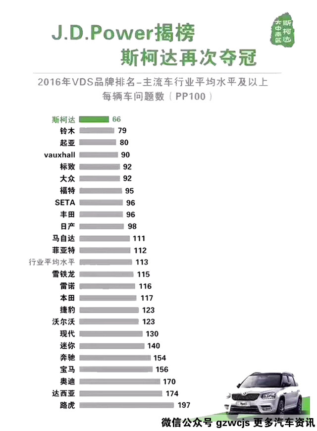 斯柯达作为大众旗下的品牌,它在技术上与大众齐平,产品力与同级别的大众在同一水平。与此同时它超过百年的历史底蕴,也让它在世界市场饱受好评。在海外与大众处于同样等级下的斯柯达,相比起大众更能博得消费者青睐。这点从2016年英国J.D.Power揭榜的数据就不难看出,斯柯达连续两年被评定为英国地区最可靠的汽车品牌,并以平均数66的成绩摘下桂冠。