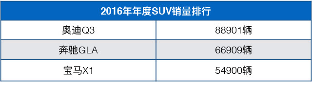 单说车辆产品也并不行,我们需要结合市场上销量的成绩来进一步参考,在2016年年度SUV销量排行榜上,奥迪Q3的销量超越了奔驰GLA和宝马X1,毕竟奥迪Q3以着德国BBA的档次,却卖着最便宜的价格,而且各方面行驶质感,配置都足够,卖得好不奇怪。