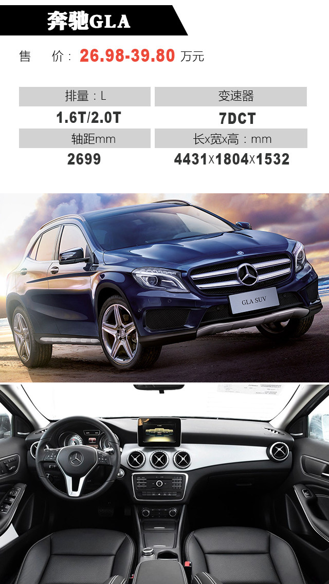 奔驰GLA看上去就像台加高版的A级,内饰风格也相似,车身的最小离地间隙达到204mm,虽然它拥有着比轿车更高的通过性,但后排腿部空间一般般,只有1拳左右的长度而已,如果你是想用于家用的,奔驰GLA的空间恐怕满足不了,另外,2.0T的高功率动力+前驱平台打造的适时四驱,足以满足你对小越野的心。