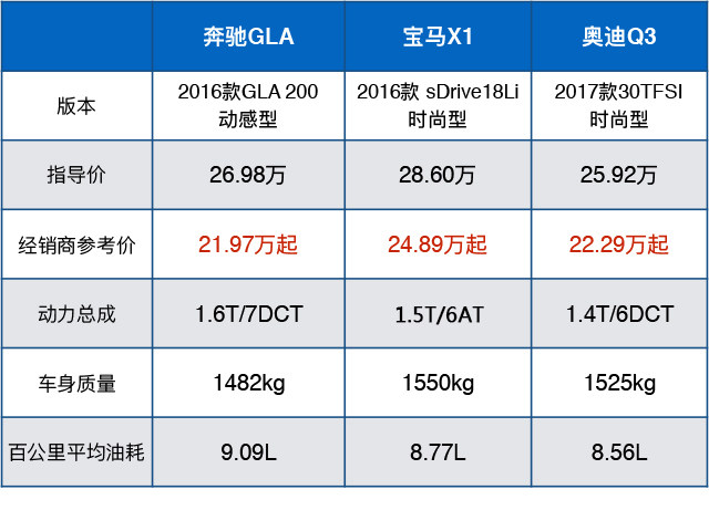 根据每个车型的最低配,教授来一次车主收集的综合路况平均油耗对比,奥迪Q3的油耗表现最经济,另外宝马X1和奔驰GLA维持在9L左右。