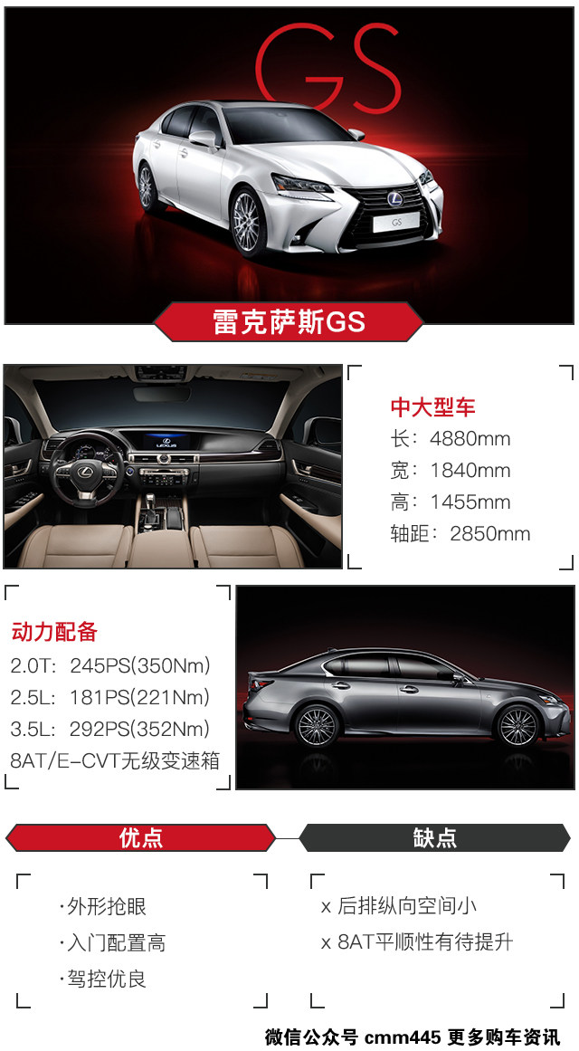 雷克萨斯品牌在我印象中一直是很有品味的,这是BBA无法给予的。竞争对手纷纷国产化降低售价,雷克萨斯为了保证品质,依旧采用整车进口方式销售。近年来雷克萨斯已经不再是沉稳老旧的气质,全新的纺锤型中网和分体式大灯设计手法越来越老练,推出每一款新车都能让人眼前一亮,而雷克萨斯GS就是其中一款最具独特的。