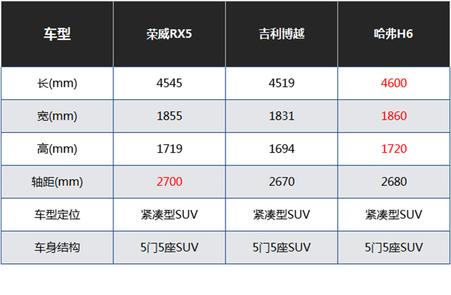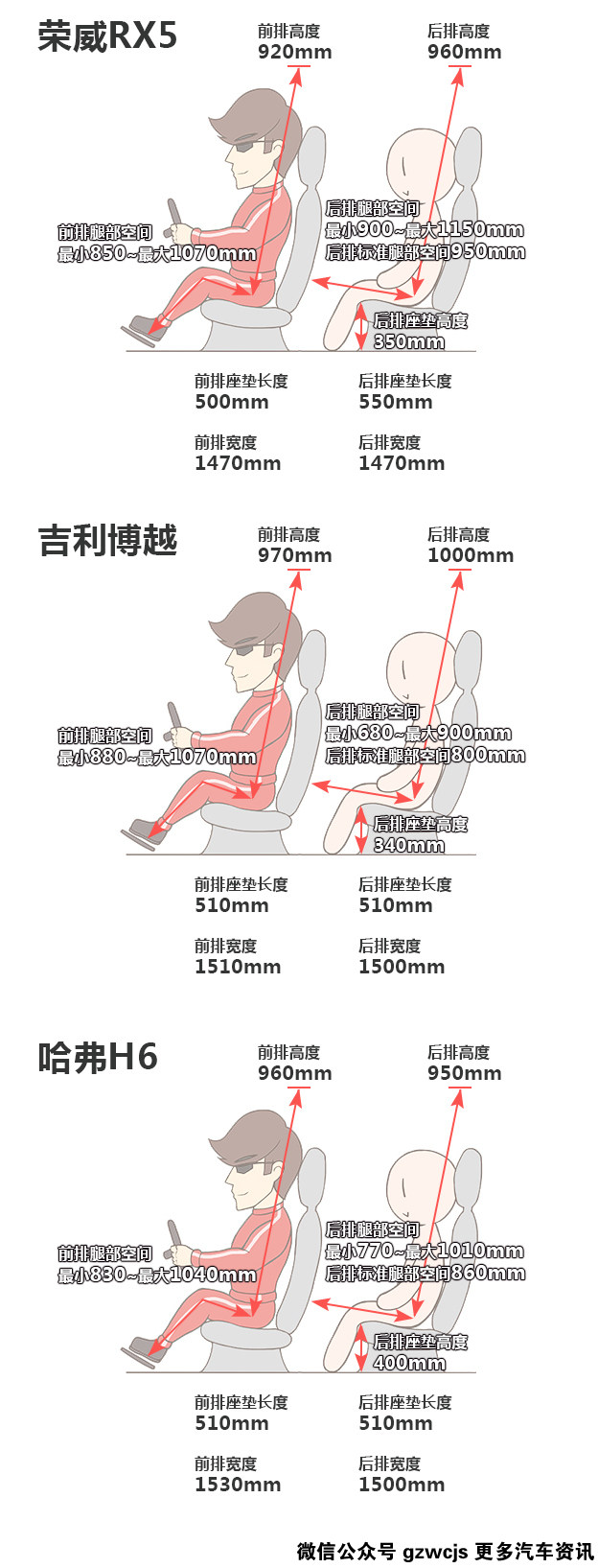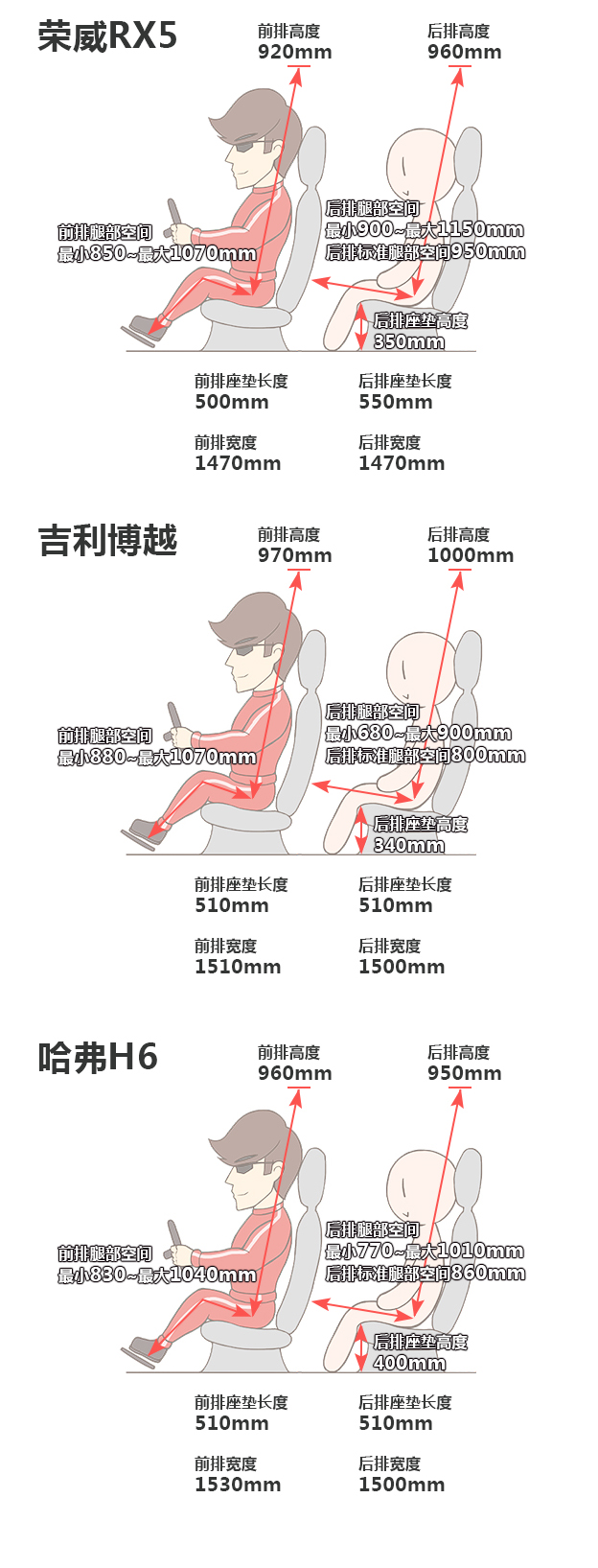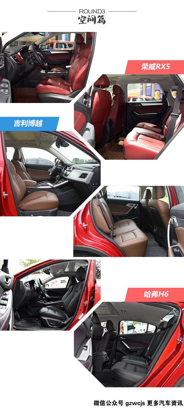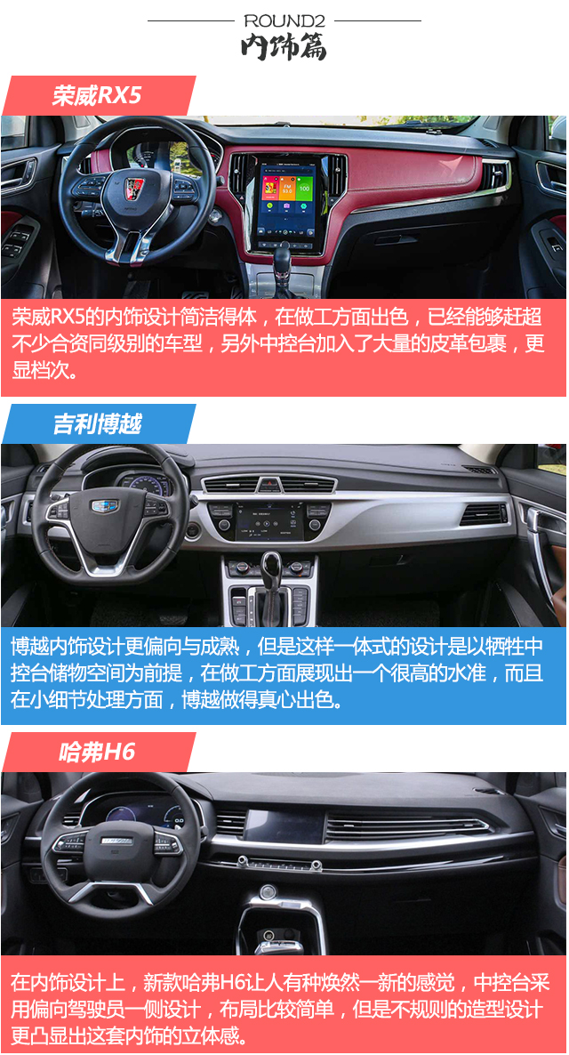 由于哈弗H6刚改款不久,并没有准确的空间数据,所以文中哈弗H6的数据依旧采用了老款车型,但值得一说的是新款车型在尺寸方面均有所提升,所以相信在空间表现上会比老款的更为突出,而在这三款车型中,荣威RX5的轴距是最大的,也正因如此在后排腿部空间的表现上荣威RX5占优,但就论内部空间宽度而言,哈弗H6表现更好,而博越并没有过多出色的亮点,表现中规中矩。