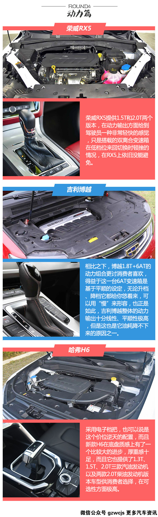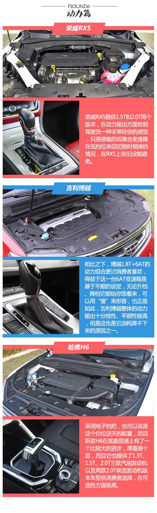 在配置方面,由于哈弗H6在价格方面存在着极大的优势,所以在相同的前提下,在配置上也有了绝对的优势,而荣威RX5由于自身售价较高,所以在配置表上还是有所差距,但是在配置表中没提到的是荣威RX5主打的是“互联网”,也是首款量产的互联网SUV,该系统功能强大,随着互联网的日渐深入,相信以后在实用性方面也会越来越高。而对于博越而言,这个价位竟然已经能买到4驱版本的车型,无疑相当吸引,而且在博越上的这一套互联系统其实基本上能与荣威RX5媲美,只是在功能的应用上稍逊。就论配置水平而言,这几款10多万售价的国产SUV已经达到合资25万以上的配置水平。