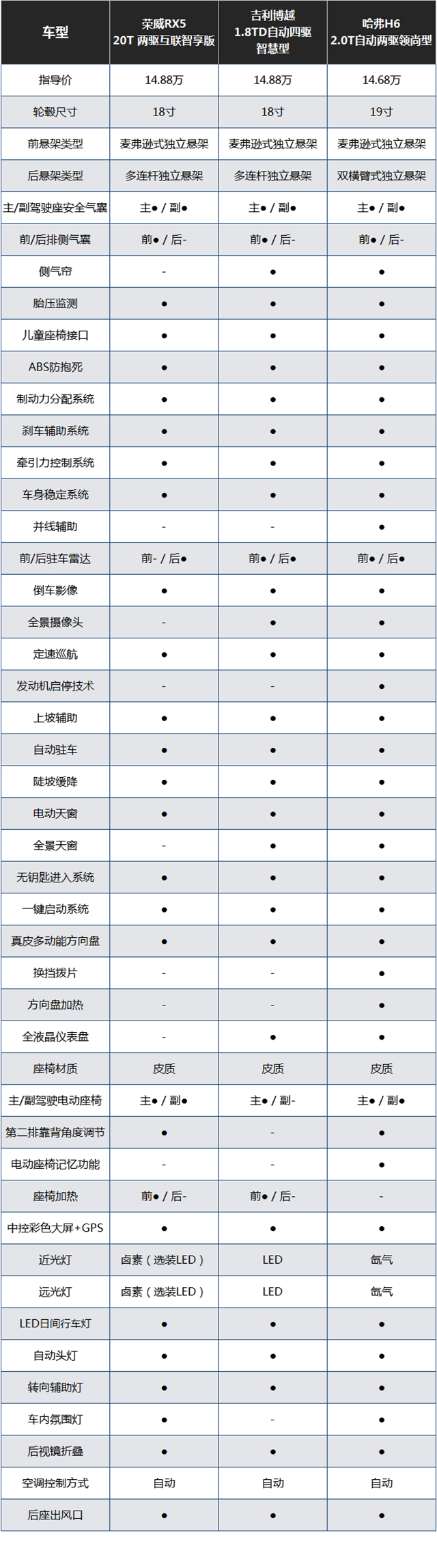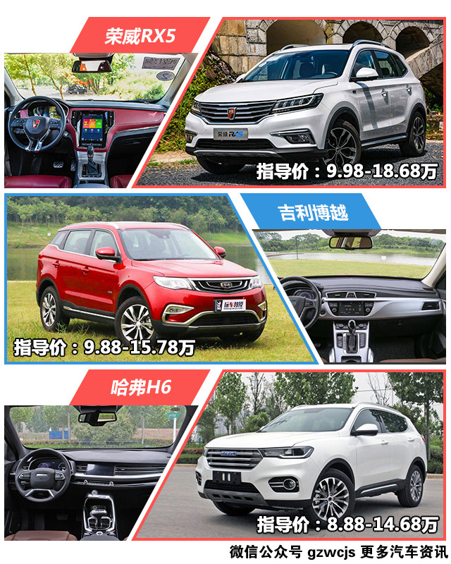 8-15万应该买一个怎么样的国产SUV才划算?相信这一个问题已经困扰着消费者很长时间了。在这一个价位区间,汇聚了绝大多数国产品牌的明星车型!每一款都是爆款、每一款都是性价比十足!而在这一类明星产品中,最受消费者关注的莫过于哈弗H6、吉利博越以及荣威的RX5,究竟这三款车型到底选择谁性价比高呢?今天你就知道了。