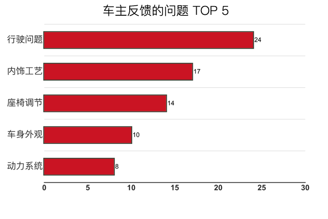 车主反馈最多的问题在行驶方面,大多数反馈刹车有尖锐杂音,这个应该要检查一下刹车盘或刹车片了...其他的行驶问题倒还真不多,值得表扬。