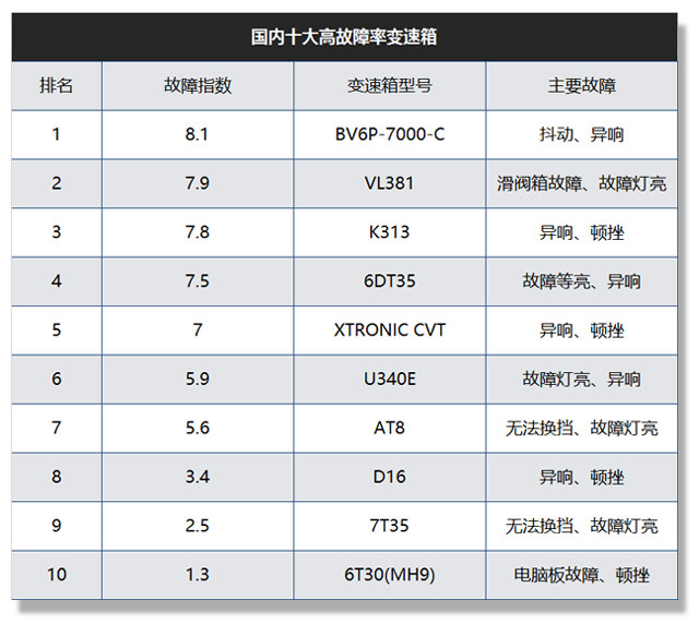 说到双离合变速箱和传统AT变速箱的利弊,相信有关注教授的网友的早已是耳熟能详了。虽说双离合变速器具有换挡快并且省油的优点,但由于结构因素,导致它在耐用性以及换挡平顺性仍无法与AT变速箱所媲美。这点在车质网发布“国内十大高故障率变速箱指数研究”中其实就不难看出。