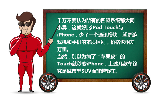 而拥有差速锁的适时四驱或全时四驱的车型则比没有的具备更强的越野性能。