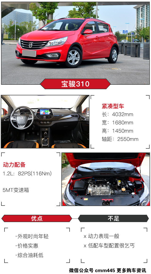 宝骏不愧为国民品牌,看看宝骏310这车子,应该算是上下班代步的神器了吧!关键外观设计够时尚,上汽的机械品质向来都不错,好开易上手,而且对于穷苦逼来说关键还省油。几万块的车子内饰一点都不掉档次,小虎敢说绝对是上10万车子的质感,皮质座椅、中控大显示屏、电动天窗、前排侧气囊、定速巡航都有配备。只需6888你就可以带回家,然后之后一个月供一千多块,这么好的套路只要不是无业游民都能买得起。