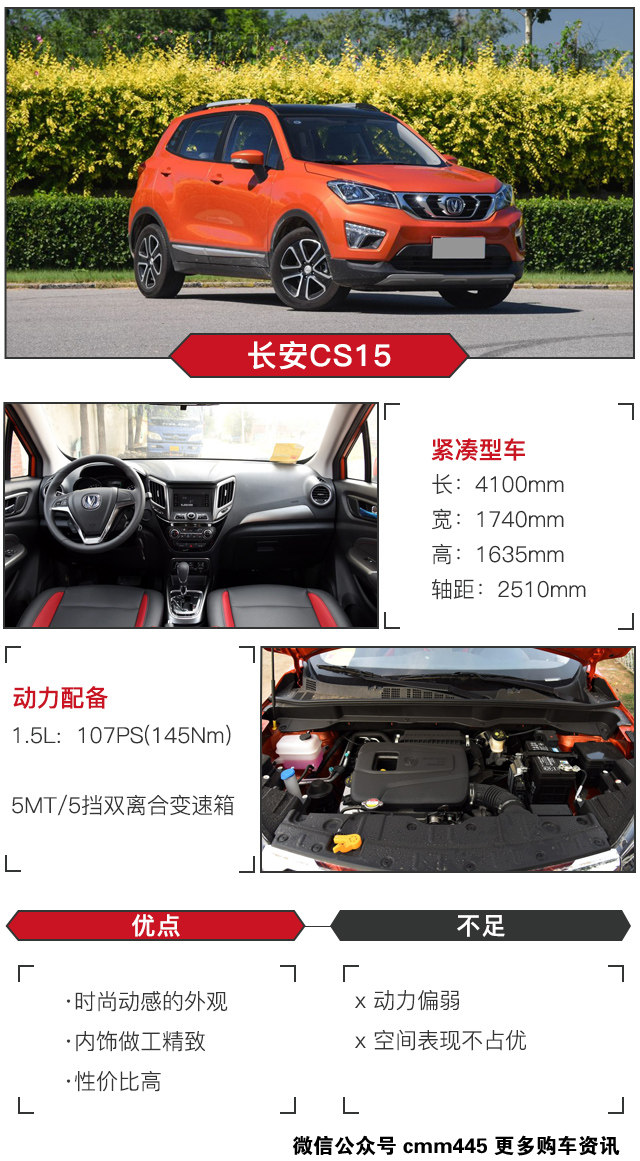 长安的品质在众多自主品牌里还是比较好的,CS15作为专门为年轻人打造的一款车,在这个价位来说性价比还是很不错的。车身稳定系统除了最低配外都有配备,日间行车灯、多功能真皮方向盘、上坡辅助、倒车影像、胎压监测等配置没有缺阵。而且对于怕开手动挡的年轻人,其5挡湿式双离合变速器已经调校得很不错了,平顺性好,只要不是很激烈驾驶,这套动力组合不会让你失望。