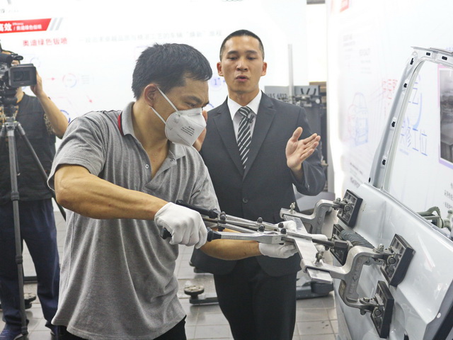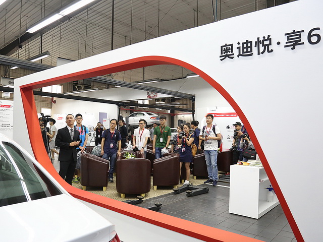 随后我们来到奥迪售后服务车间,全方位体验了一汽-大众奥迪“温暖、高效、个性、专属、数字化”的服务项目。专业讲师为我们讲解了原厂以及非原厂的备件、以及判别真假配件的方法,展示的备件有刹车片和滤清器等物品。接着,讲师和钣喷师傅为我们展示了钣喷的部分工序,让我们了解到了奥迪的绿色钣喷有着高效、高质、环保的服务维修特点,并且采用很规范的作业环境、严谨的工艺流程,这样也有助于提升车辆维修品质、保障车辆的安全系数。