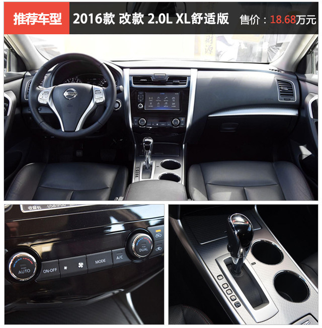 推荐购买的是2016款 改款 2.0L XL舒适版,2.0L车型的次顶配,该有的配置都有了,倒车影像、定速巡航、无钥匙进入/启动、多功能方向盘,主/副驾驶座椅电动调节、LED近光灯、自动大灯、自动空调、后排出风口,算上优惠之后18万左右可以落地。