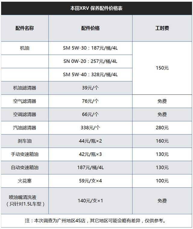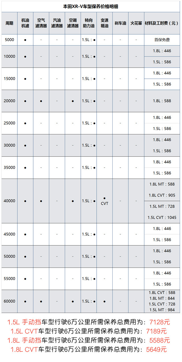 车型小结:本田XRV有着1.5L和1.8L两种排量,但由于1.5L为地球梦系列直喷发动机,所以每一次保养都不得不添加喷油嘴清洗液,正因如此1.5L主力销售车型的整体保养费用比起老款采用多点喷射1.8L排量要高上1500左右,并且仅有首保免费的政策也显得诚意不足。