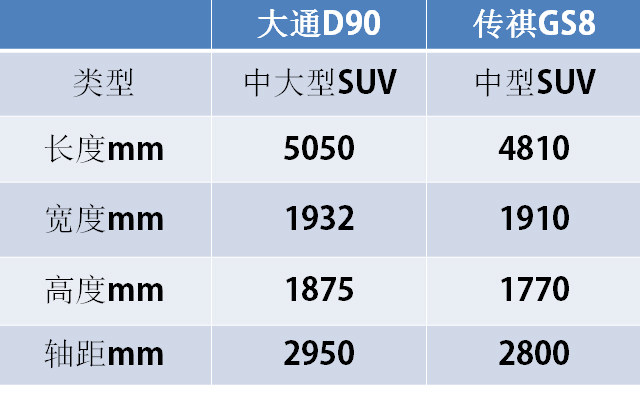 总的来说,这次大通D90给我们带来了不少亮点,包括它的全车个性化定制,超强动力参数,超大车身尺寸,前纵置后驱,可选择分时四驱和适时四驱,非承载式车身设计等等。而传祺GS8则定位于典型城市SUV,空间大颜值高操控好,非常实用,售价:16.38-25.98万,且已经获得了市场上非常不错的反响,至于即将上市的大通D90,如果最低配的起步价能够在16万起步,教授相信它还是会有竞争力的。