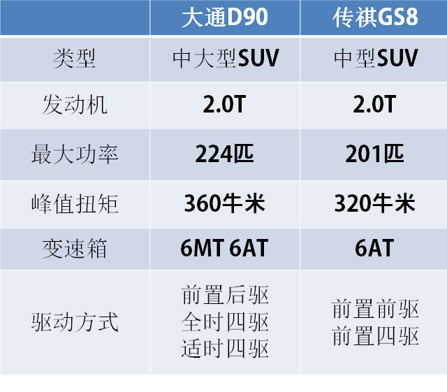 大通D90的发动机参数已经算很高了,次于长安的蓝鲸2.0T发动机,同时已经超越了许多其他自主品牌的2.0T发动机,但这东西关键还是得看与变速箱的匹配程度,但是起码它的纵置后驱设计,已经让不少老司机抓狂了,着急想等到它的到来,想好好去越野道路试驾一番,而传祺GS8的动力参数,属于典型的家用城市SUV,能够在保持基本的城市代步功能外,还保持住良好的燃油经济性,所以在这两点上,它们还是有所不同的。