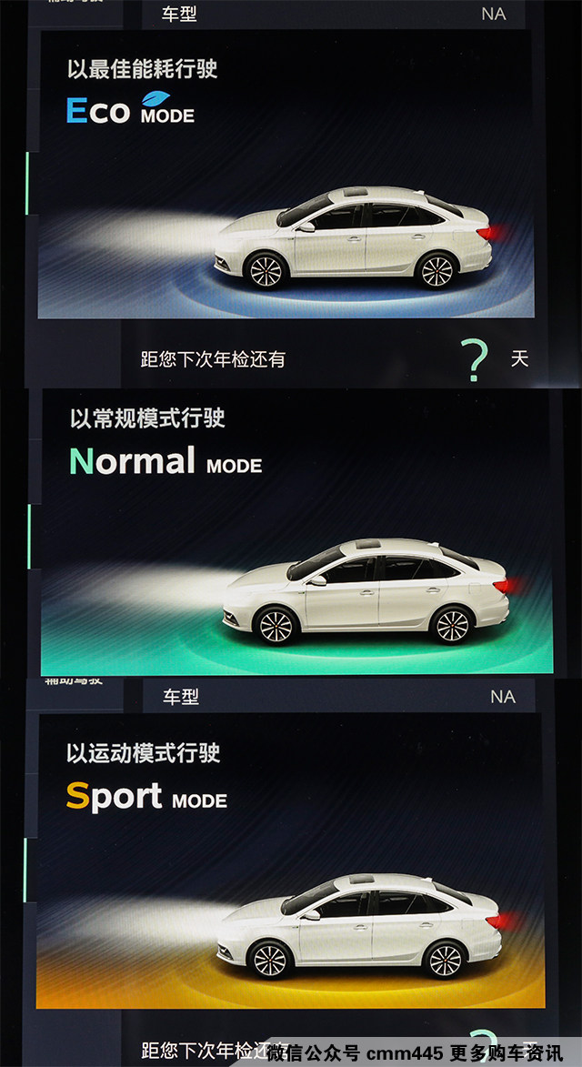 荣威ei6共有三种驾驶模式可选择,为别为:eco经济/normal正常/sport运动。eco模式下有着较高的经济性,油门显得慵懒,适合与城市驾驶;normal模式则兼顾动力驾驶和用车经济性的平衡,适合与城市与国道驾驶;sport模式则是追求动力的输出,发动机和电动机一起发力,虽然没有很强的推背感,但足以能让你满足,适合与高速行驶,动力随叫随到,变得更为直接干脆。