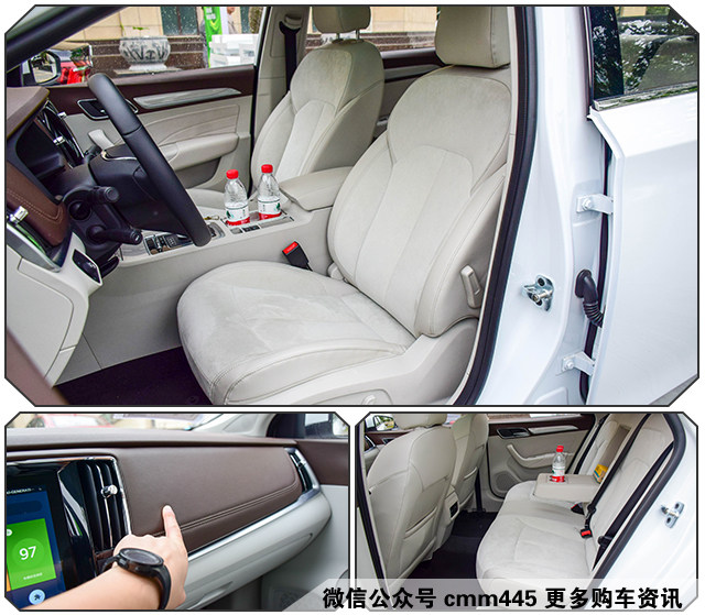 用料方面颇为厚道,中控台和门扶手都采用了皮质包裹,触感表现不错,且ei6座椅采用Alcantara和传统皮质搭配,乘坐舒适性和摩擦力都很好,但浅色的座椅,日后用车打理需要勤养护。由于加入电池组,后备箱的容积有一定范围的缩小,但能满足日常使用。