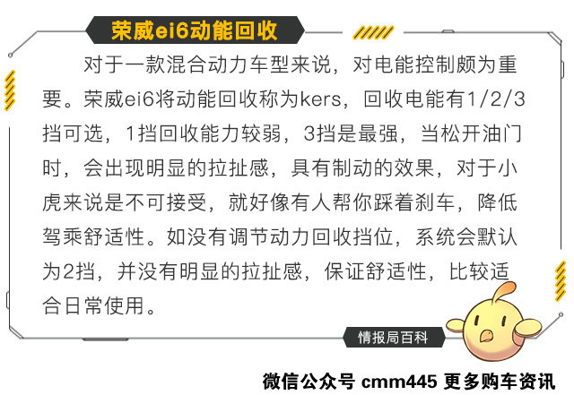 荣威ei6搭载1.0t三缸涡轮增压发动机及电动机,三缸发动机天生就有抖动的特性,不过由于荣威ei6是混动车型,在低速行驶及怠速都是采用纯电模式行驶,很好地避免了抖动现象。当速度超过70km发动机介入后发动机依然很淡定,只有当你深踩油门时,通过方向盘才会感觉到有着轻微振动。这套动力总成的表现很能让人称赞,无论是在哪个速度区间,都保持着较高的平顺性。
