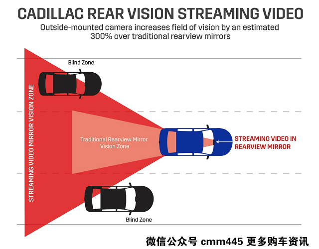 图片不用太在意上面的英文,别装得好像你能看懂似得。其实图片内容很容易意会,浅红色的区域是传统后视镜的视野,而红色区域就是流媒体后视镜的视野。