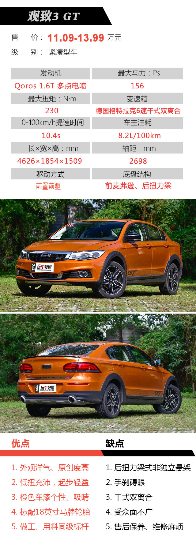 点评:论洋气,观致绝不亚于那边混得风生水起的宝沃。观致3 GT惊艳激进的外观却被修饰得恰到好处,夸张的离地间隙在运动套件的加持下毫不违和,教授对其外观爱不释手。要不是顾忌干式双离合的可靠性,教授也想来一台。