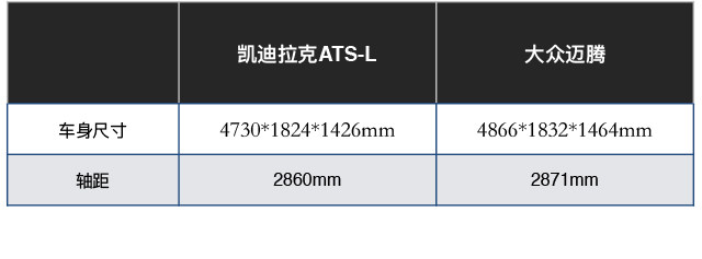 ATS-L的车身尺寸为4730*1824*1426mm,轴距为2860mm,迈腾的车身尺寸则为4866*1832*1464mm,轴距为2871mm,谁大谁小,一目了然了吧。