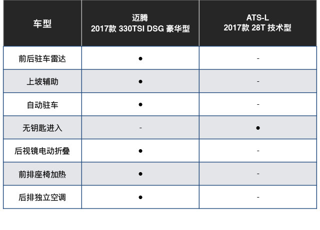 25万买到的ATS-L是乞丐版,但同价位的迈腾已经是“豪华型”,所以迈腾的配置更丰富自然是情理之中了。迈腾的配置优势可以分成两类,一类是提升逼格,另一类则是提高实用性的。