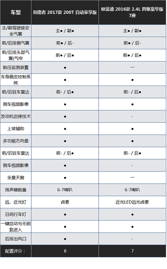 配置两款车型相差不大,基本上两者在被动安全方面做得都很出色。但实用性配置则指南者会更胜一筹,例如指南者多了胎压监测与全景天窗,这对SUV是非常必要的。而且欧蓝德作为7座SUV车型,没有后排出风口则有些不太厚道了,毕竟很多人买它都是看中它具备第三排座椅。