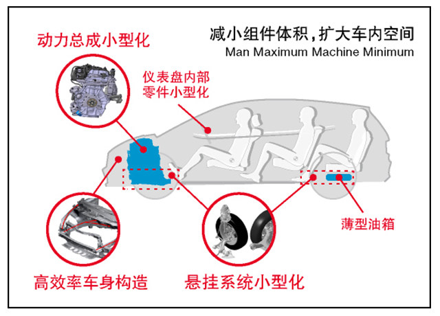 日本虽然是个小国家,但是却很重视“空间效率”,本田造车的MM理念非常出名,MM理念,中文意思就是“乘员空间更大化,机械空间更小化”,它采用了小型化的悬挂部件,高效性的吸能车身结构,中置油箱的手法,将机械空间变得最小,这样下来,驾驶舱空间就变得更大了。