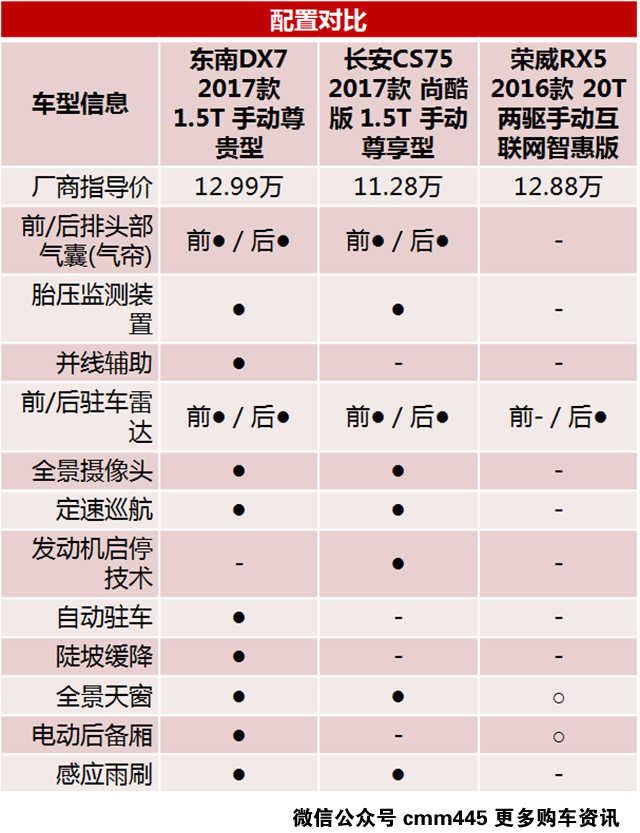 当然如果你是追求舒适为主,配置也要求比较全面的话,同级别你可以选择长安CS75、东南DX7这些整体配置较高,而且主打舒适的车型。