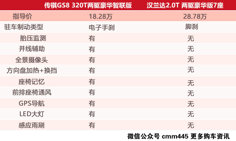 说到传祺GS8就不得不提它丰富的配置了,三温区自动空调、前排座椅通风加热、方向盘加热、三组记忆座椅、舒适进入功能、全景天窗、一键启动、360°全景影像、胎压监测、LED大灯等等配置一应俱全,比它贵上10万的汉兰达也没有这个配置水准。